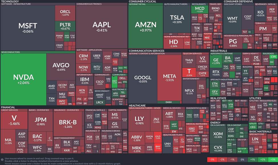 The US stock market today presents a dynamic landscape with varied performances across sectors, as depicted in the heatmap. Notably, the semiconductor sector shines bright, led by Nvidia (NVDA) with a substantial rise of 2.04%, contrasting with the general downtick in the technology sector.