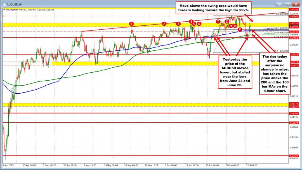 The AUDUSD is higher by 0.83% off of the decision and retracing much of the declines seen in trading yesterday. The pair is back above the 200 and 100 bar MAs on the 4-hour chart after dipping below each yesterday to test the lows from June 24 and June 25. The pair is back testing a swing area between 0.65357 to 0.65537. Move above and traders will be eying the highs from last week and the year at 0.6590.